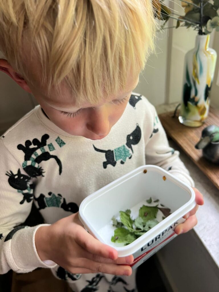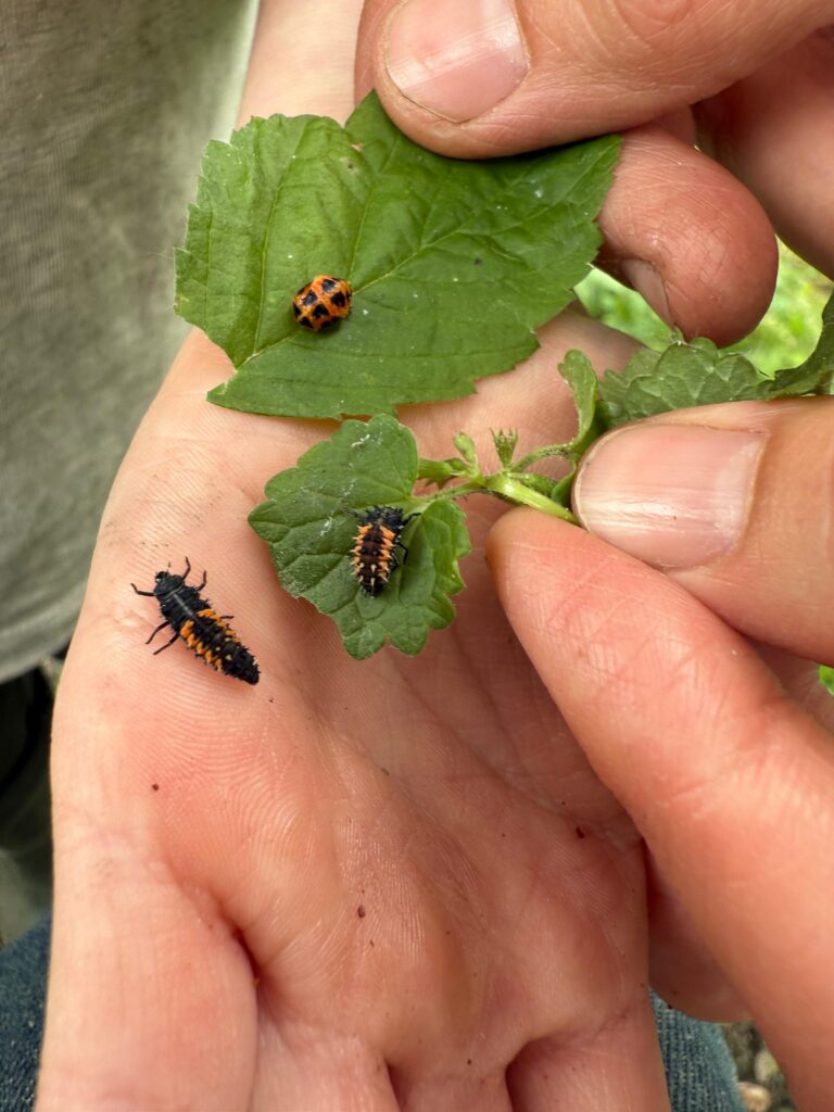 Hé, wat zien we daar in de keuken? Is het tijd voor beschuit met muisjes? Ja, hoor! Vannacht zijn zijn lieveheersbeestjes uit hun cocon gekomen. Vol verwondering kijken we naar de gele, stiploze lieveheersbeestjes. Meteen weer wat nieuws geleerd. Blijkbaar worden ze altijd zo geboren, geel en stiploos. Binnen ongeveer 24 uur krijgen ze hun mooie, rode kleur en kenmerkende stippen. We eten wat en zetten dan de eerste lieveheersbeestjes die al wat kleur hebben terug in de tuin. Een week na het lezen van een boek over lieveheersbeestjes vonden we overal in de tuin larven en cocons. Nu hebben we het met eigen ogen van dichtbij kunnen zien. Echt een wonder!