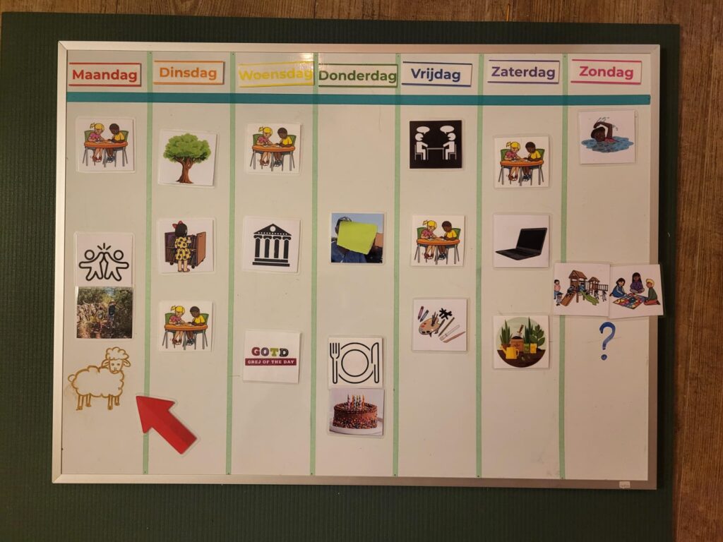 Wij werken met een weekplanning. Zondagmiddag ga ik samen met de kinderen zitten om een planning voor de komende week te maken. Een aantal afspraken staat al vast. Samen met de kinderen kijken we naar hun wensen en naar hoe we daar invulling aan kunnen geven. Op het planbord maken we met picto’s en getekende plaatjes een grove planning voor de week.